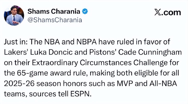当NBA实施65场评奖规则,不少球星因为参赛场次不够无缘参与评奖。如今根据ESPN名记Shams报道,NBA和球员工会裁定,东契奇和坎宁安利用65场新规的“特殊情况挑战”申诉成功,他们获得评奖资格,而爱德华兹申诉失败无缘评奖。