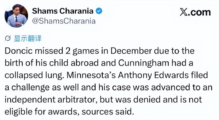 恭喜! 东契奇坎宁安申诉成功获评奖资格 爱德华兹申诉被驳回